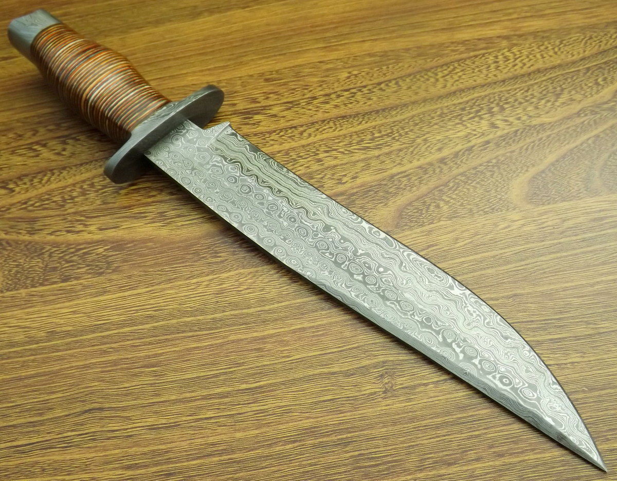 HERE WE HAVE A CUSTOM HAND MADE DAMASCUS STEEL HUNTING BOWIE KNIFE WITH DIFFERENT KIND OF SHAPE. OVER ALL LENGTH IS 15.00 INCHES, HANDLE IS MADE OF MULTI PAKKA WOOD, BLADE WITH A RAIN DROP PATTERN.