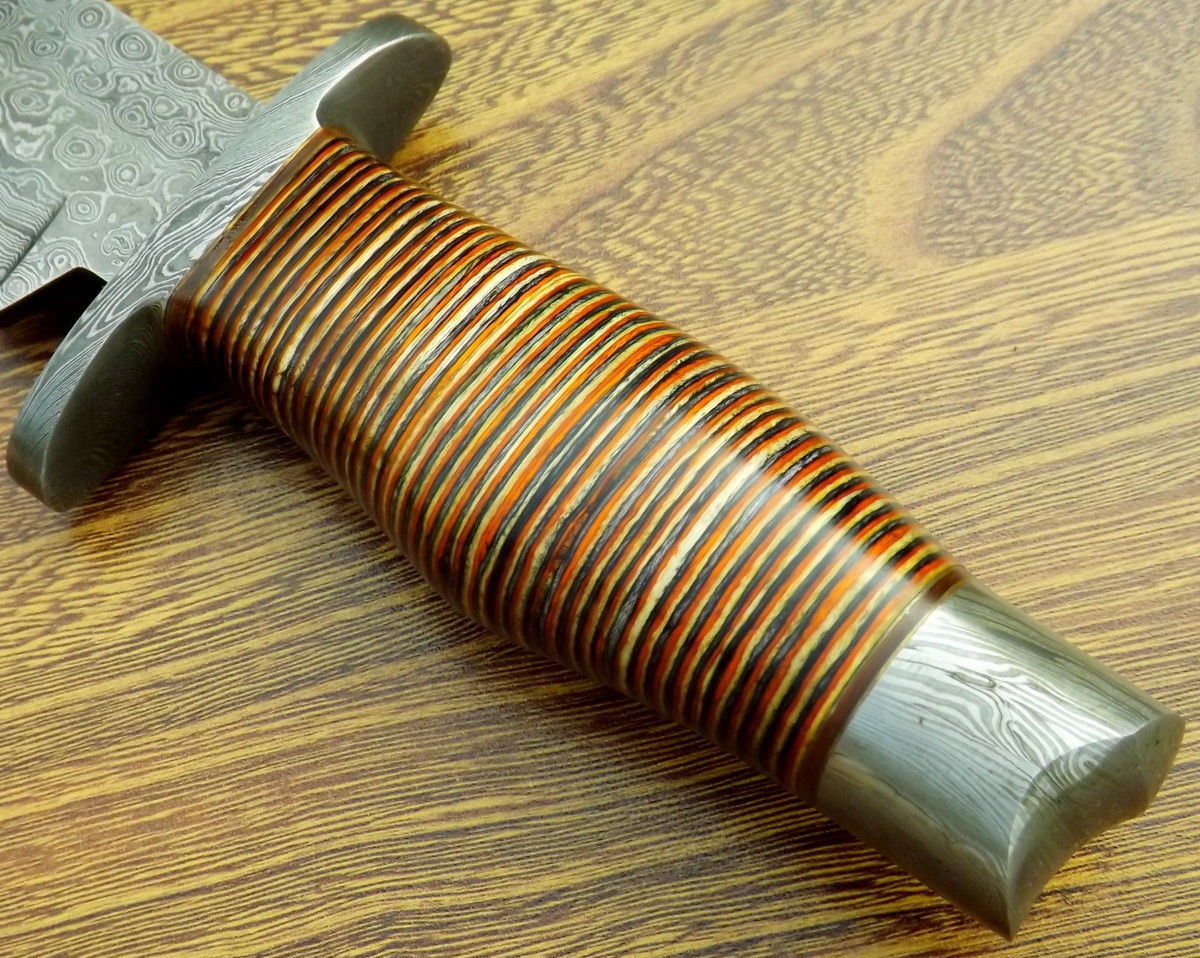 The blade is made by 1095 / 15N20 Alloy Steels (352 Layers) forged by hammer to a beautiful and precise pattern. Damascus Steel has high quality contents to give it an excellent edge and sharp cutting ability. Hardness of the Blade is HRC 57-59. It is hand sharpened to a sharp edge and holds cutting edge after heavy use.