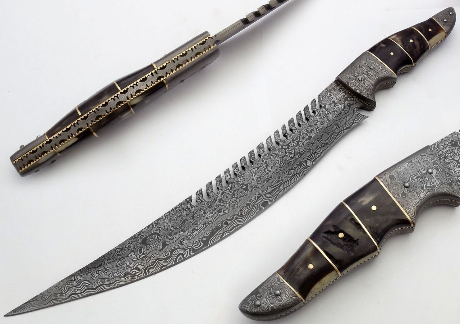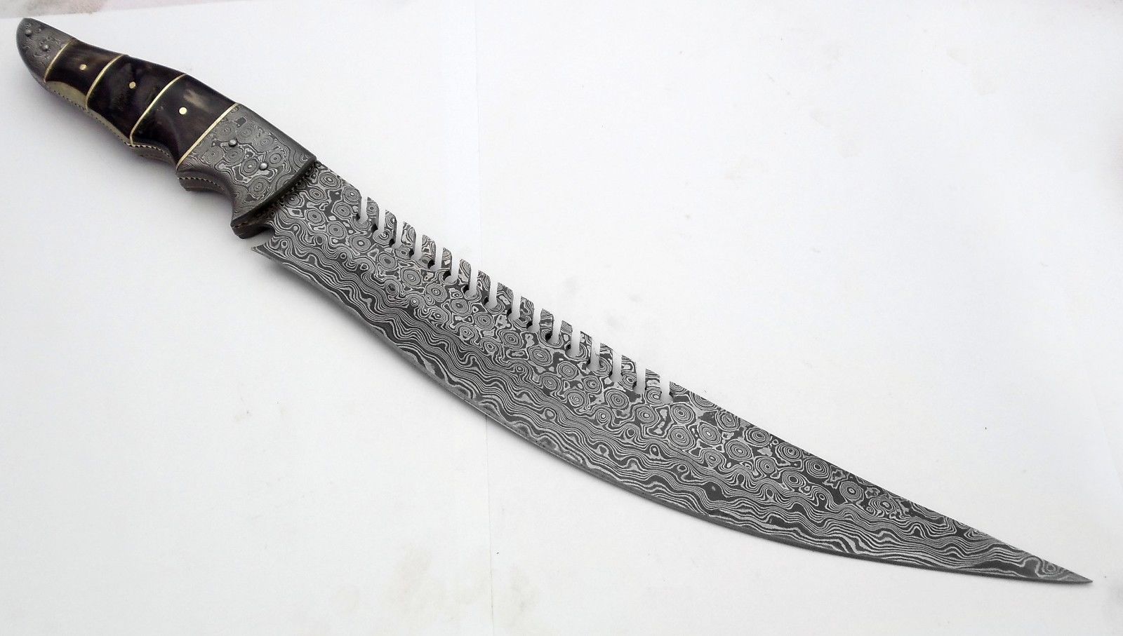 HERE WE HAVE A CUSTOM HAND MADE DAMASCUS STEEL HUNTING BOWIE KNIFE WITH DIFFERENT KIND OF SHAPE. OVER ALL LENGTH IS 17.00 INCHES, HANDLE IS MADE OF NATURAL RAM HORN, BLADE WITH A RAIN DROP PATTERN.