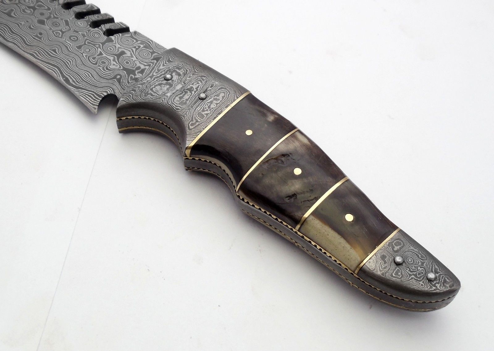 Superb Bowie Hunting Knife Damascus Steel Blade Outdoor Camping-17.00 Inches Beautiful NATURAL RAM HORN Handle With Leather Sheath