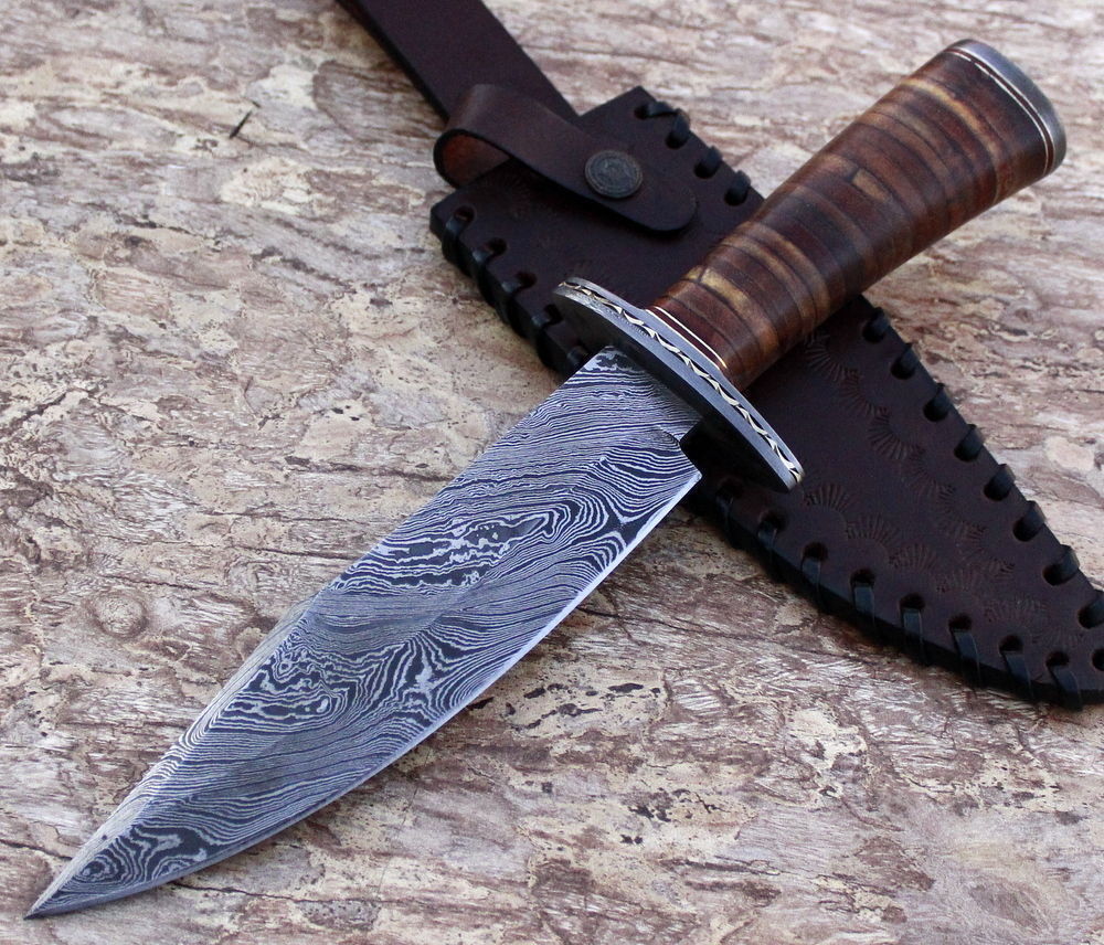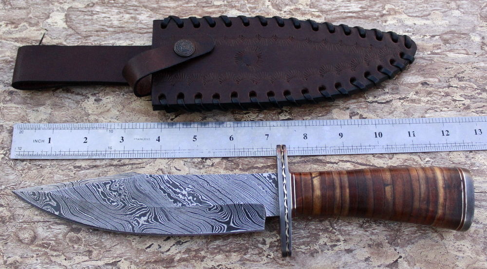HERE WE HAVE A CUSTOM HAND MADE DAMASCUS STEEL HUNTING BOWIE KNIFE WITH DIFFERENT KIND OF SHAPE. OVER ALL LENGTH IS 12.00 INCHES, HANDLE IS MADE OF NATURAL LEATHER WITH ROSE WOOD, BLADE WITH A TWIST PATTERN.