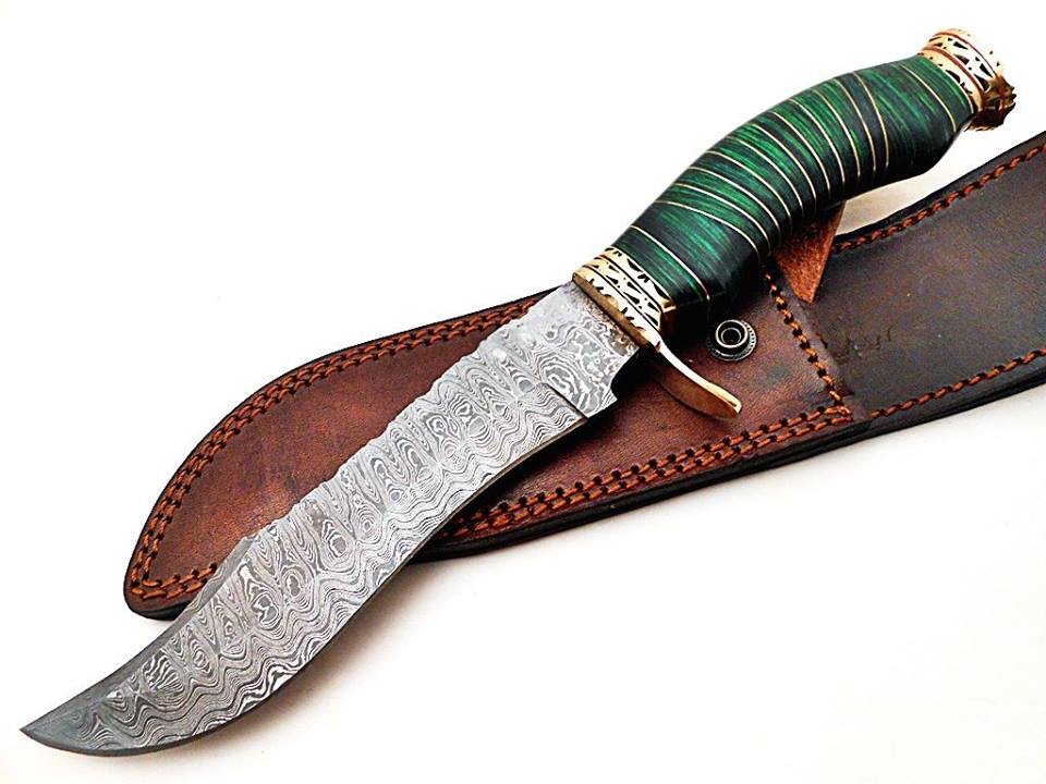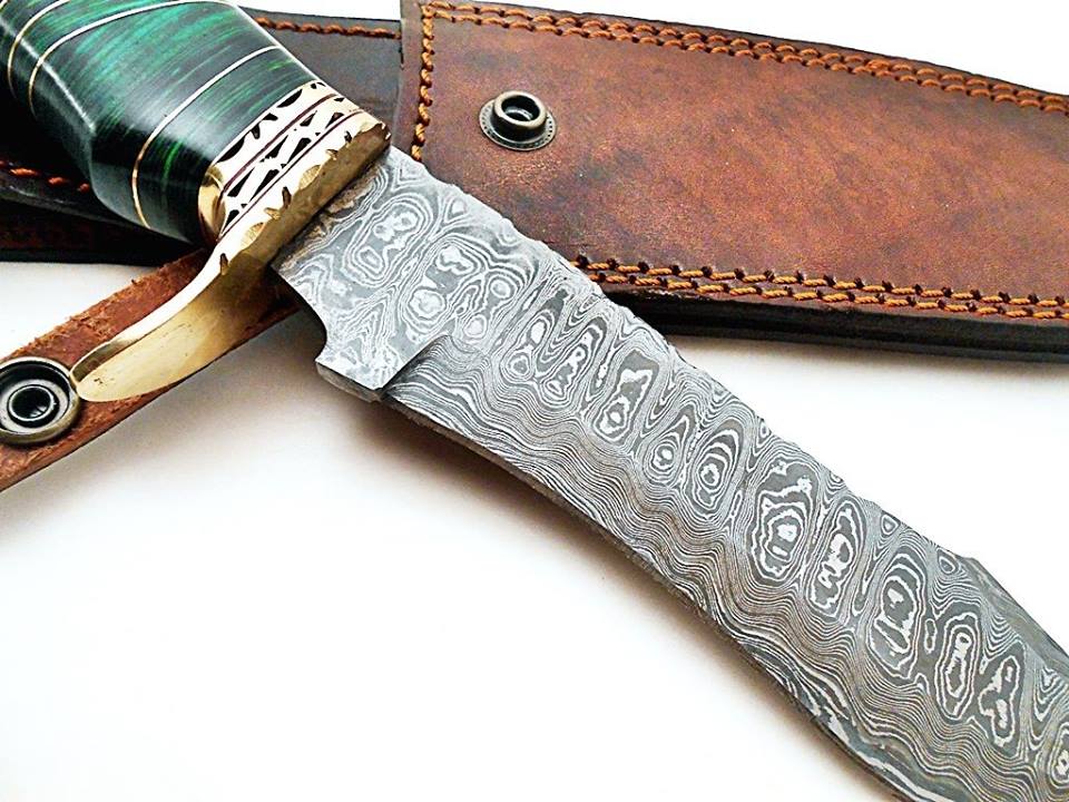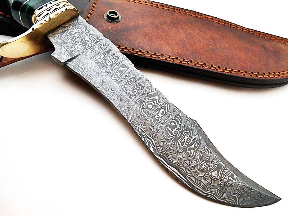 Astonishing Bowie Hunting Knife Custom Handmade Damascus Steel Survival Knife Beautiful Green Colored Wood Handle That’s Make a Beautiful Combination of 12.50 Inches Knife For Outdoor, Camping, Hunting & Survival Purpose With Amazing Handmade Genuine Leather Sheath