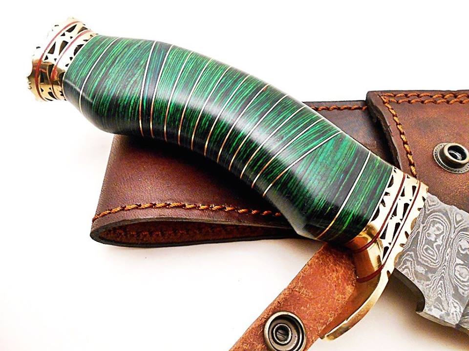 HERE WE HAVE A CUSTOM HAND MADE DAMASCUS STEEL HUNTING BOWIE KNIFE WITH DIFFERENT KIND OF SHAPE. OVER ALL LENGTH IS 12.50 INCHES, HANDLE IS MADE OF GREEN COLORED WOOD, BLADE WITH A LADDER PATTERN.