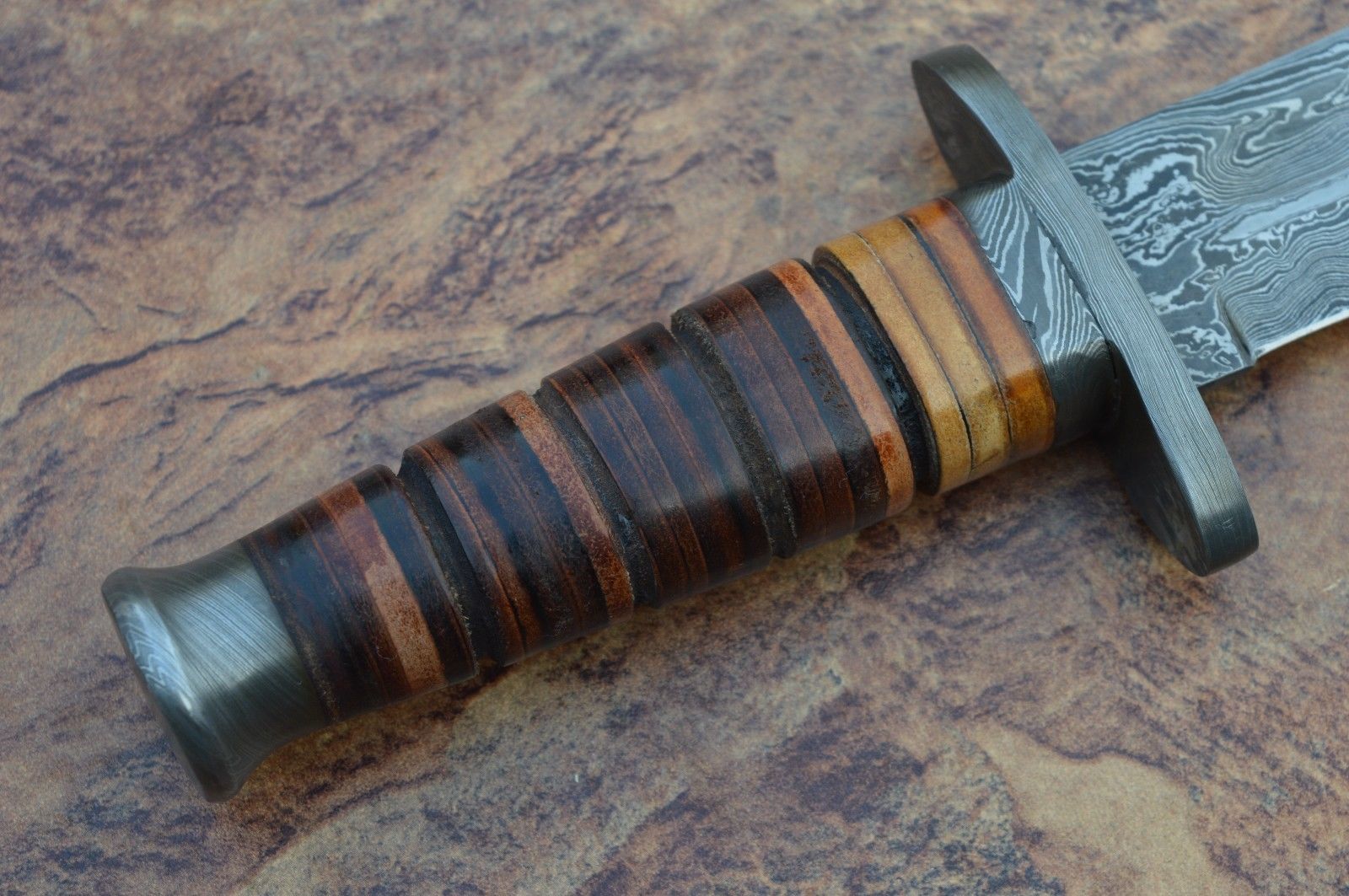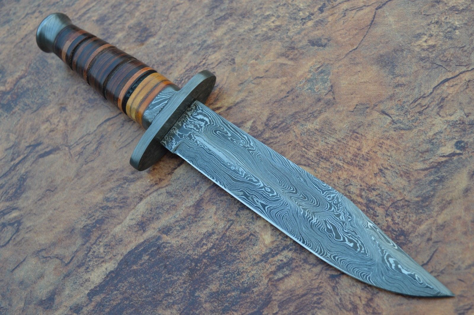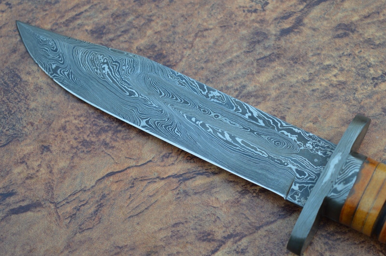 HERE WE HAVE A CUSTOM HAND MADE DAMASCUS STEEL HUNTING BOWIE KNIFE WITH DIFFERENT KIND OF SHAPE. OVER ALL LENGTH IS 12.50 INCHES, HANDLE IS MADE OF NATURAL LEATHER, BLADE WITH A TWIST PATTERN.