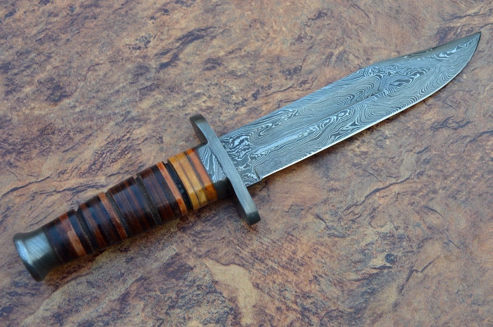 Custom Handmade Damascus Steel Hunting Bowie Knives For Hunting, Outdoors, Camping And Survival Purposes. High Quality Material Used On Handles Like Rose Wood, Oak Wood, Olive Wood, Resin Wood, Resin Sheet, Micarta, Ram Horn, Stag Horn and Damascus Steel Mostly Used On Blade.