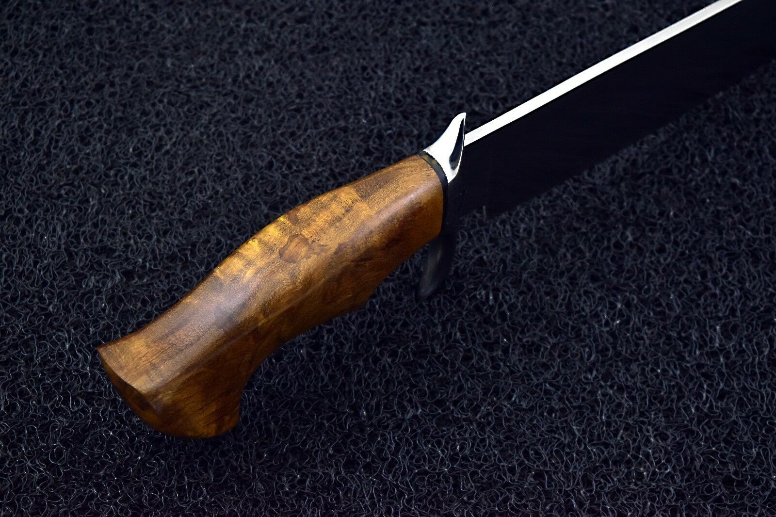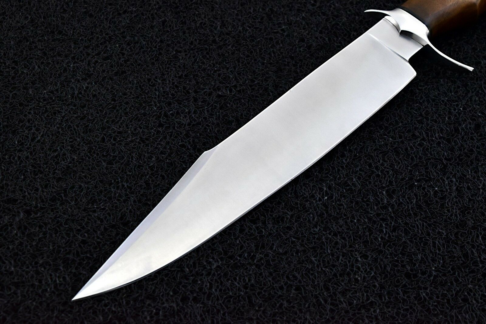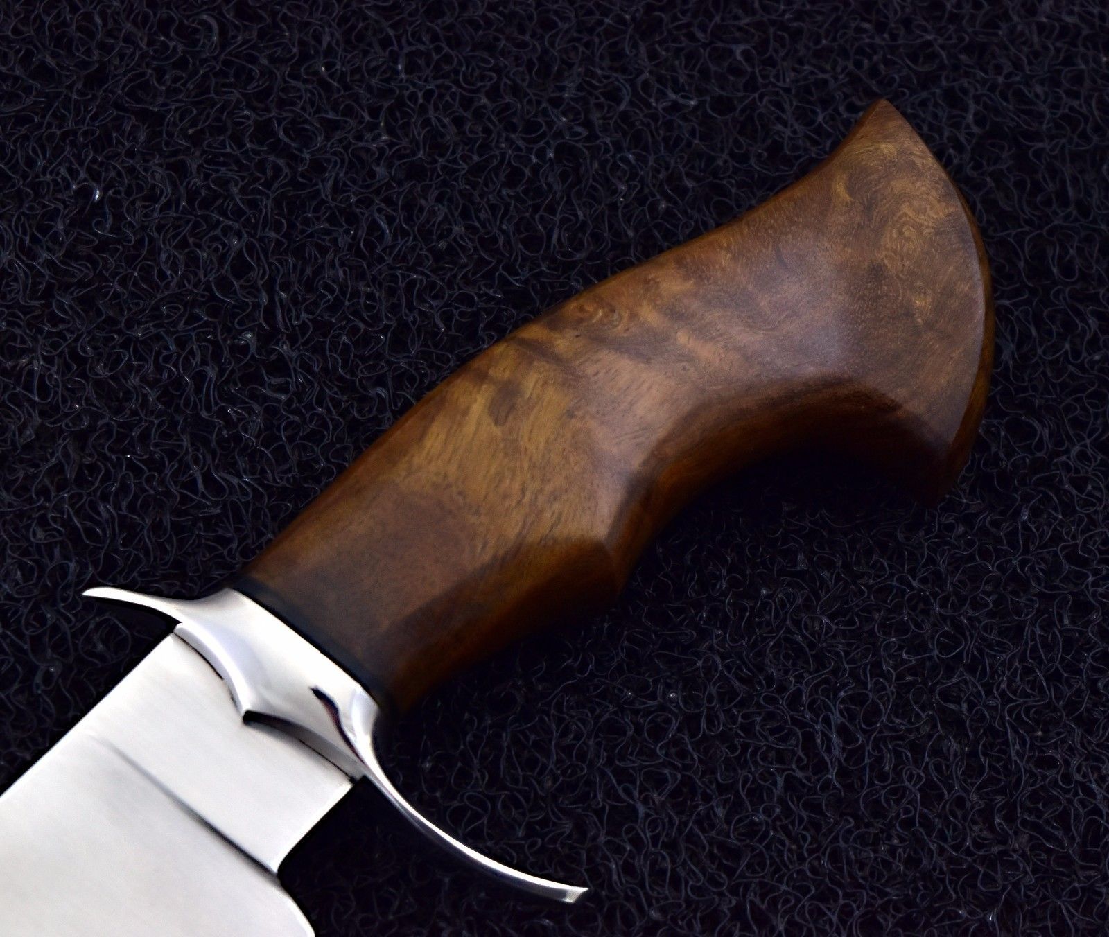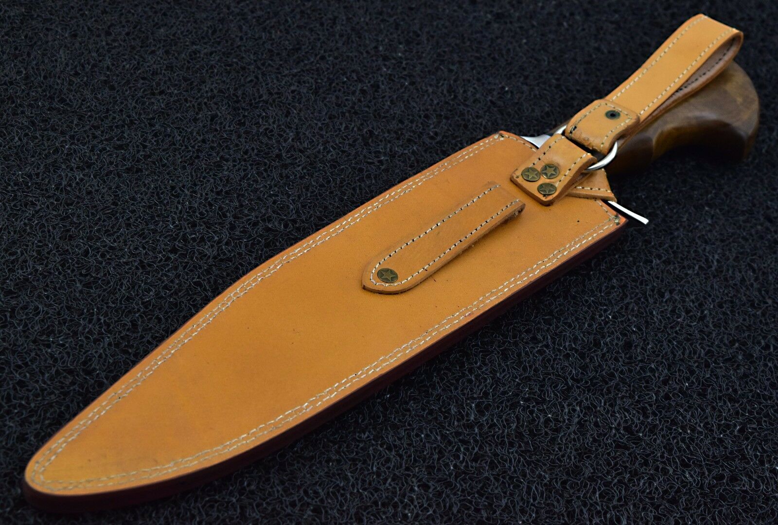 HERE WE HAVE A CUSTOM HAND MADE D-2 STEEL HUNTING BOWIE KNIFE WITH DIFFERENT KIND OF SHAPE. OVER ALL LENGTH IS 17.00 INCHES, HANDLE IS MADE OF ROSE WOOD.
