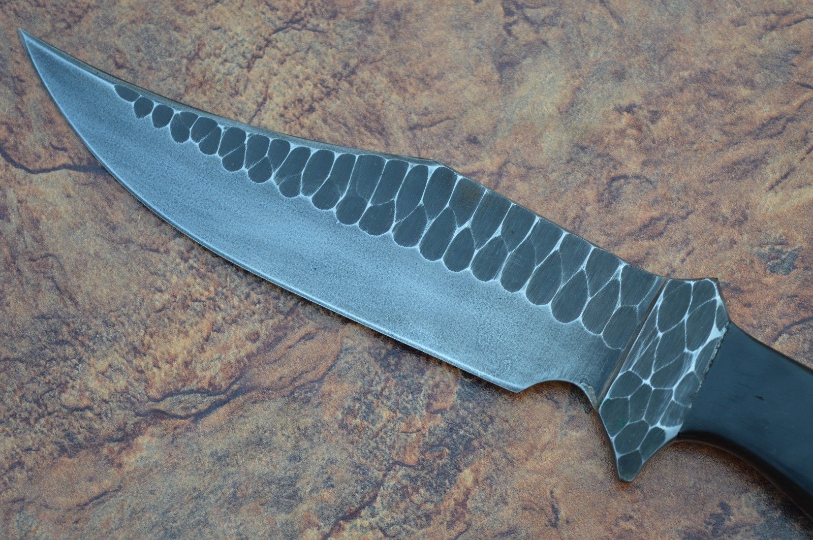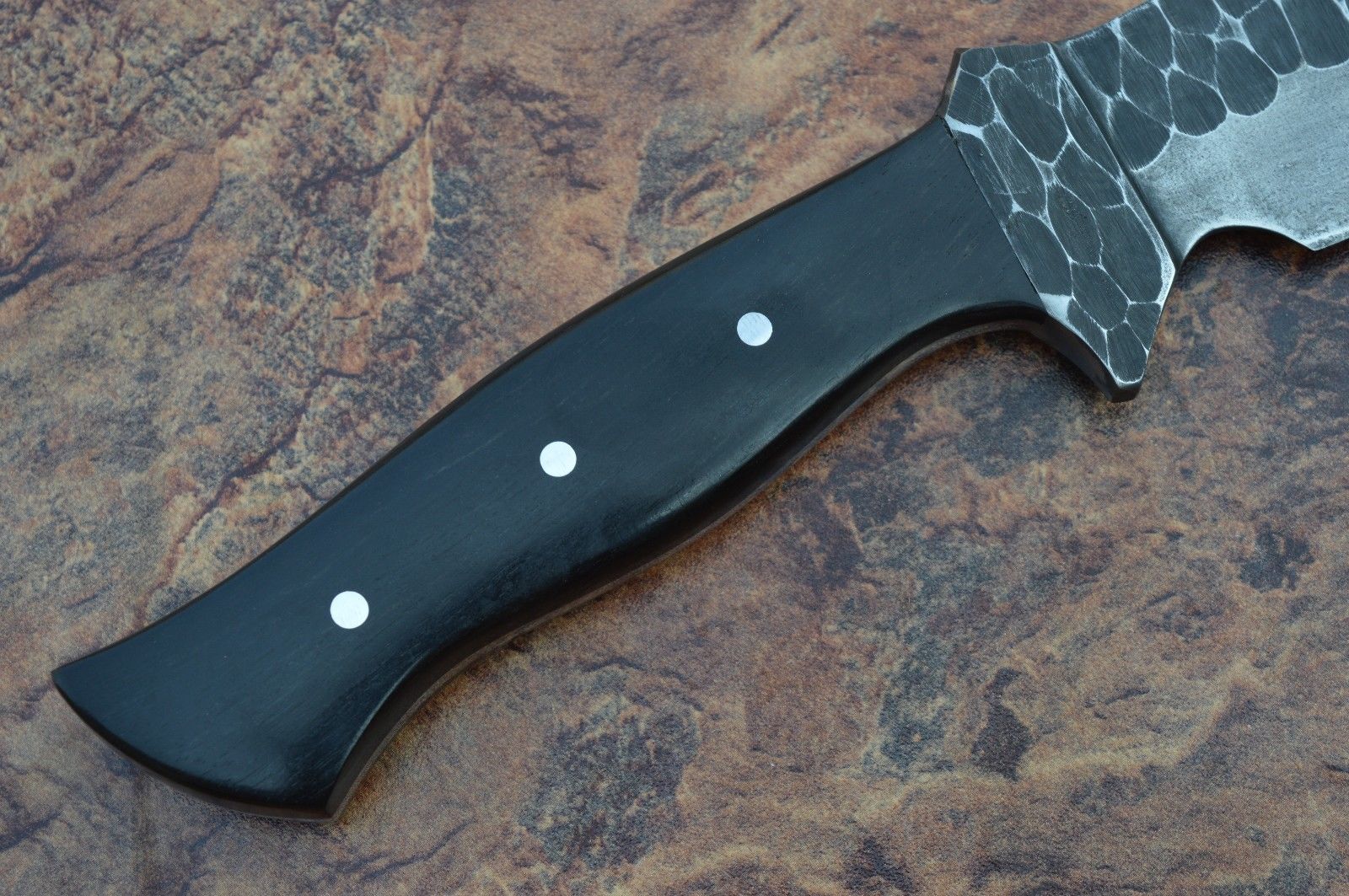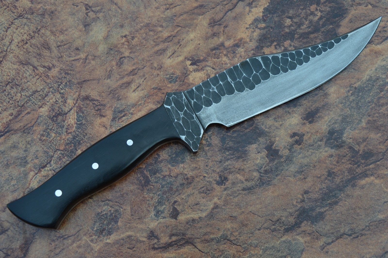 HERE WE HAVE A CUSTOM HAND MADE D-2 STEEL HUNTING BOWIE KNIFE WITH DIFFERENT KIND OF SHAPE. OVER ALL LENGTH IS 11.75 INCHES, HANDLE IS MADE OF BLACK MICARTA.