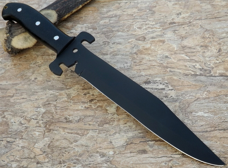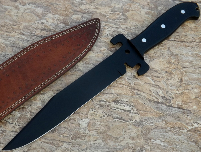 HERE WE HAVE A CUSTOM HAND MADE D-2 STEEL HUNTING BOWIE KNIFE WITH DIFFERENT KIND OF SHAPE. OVER ALL LENGTH IS 16.00 INCHES, HANDLE IS MADE OF BLACK MICARTA.