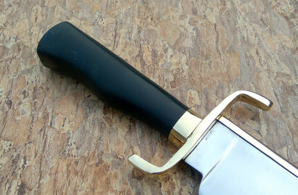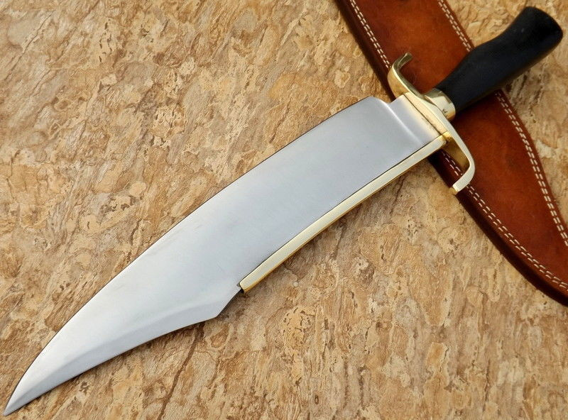 HERE WE HAVE A CUSTOM HAND MADE D-2 STEEL HUNTING BOWIE KNIFE WITH DIFFERENT KIND OF SHAPE. OVER ALL LENGTH IS 20.00 INCHES, HANDLE IS MADE OF BLACK MICARTA.