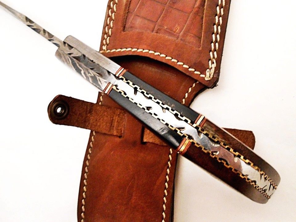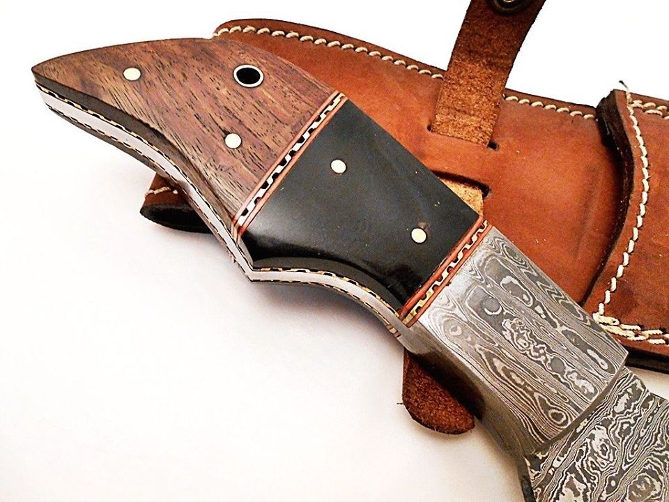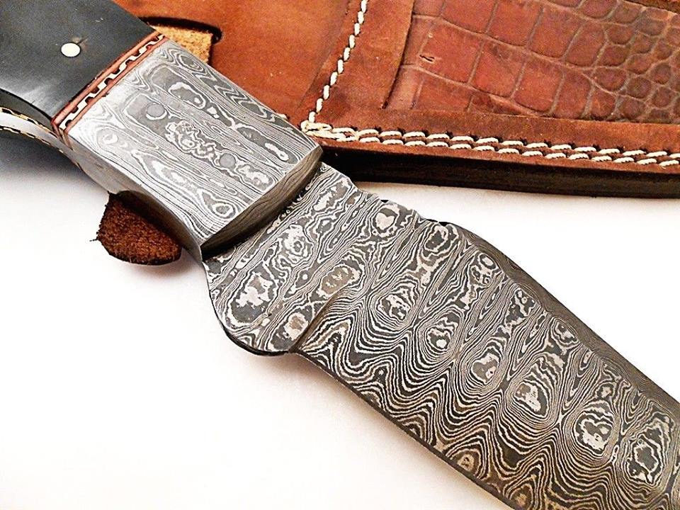 HERE WE HAVE A CUSTOM HAND MADE DAMASCUS STEEL HUNTING KNIFE WITH DIFFERENT KIND OF SHAPE. OVER ALL LENGTH IS 12.00 INCHES, HANDLE IS MADE OF NATURAL BUFFALO HORN WITH WALNUT WOOD, BLADE WITH A LADDER PATTERN.