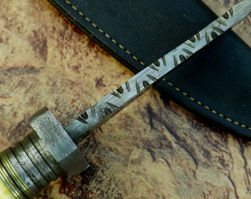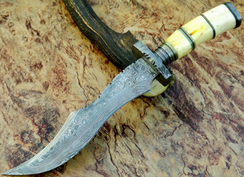 HERE WE HAVE A CUSTOM HAND MADE DAMASCUS STEEL HUNTING BOWIE KNIFE WITH DIFFERENT KIND OF SHAPE. OVER ALL LENGTH IS 13.00 INCHES, HANDLE IS MADE OF COLORED CAMEL BONE, BLADE WITH A RAIN DROP PATTERN.