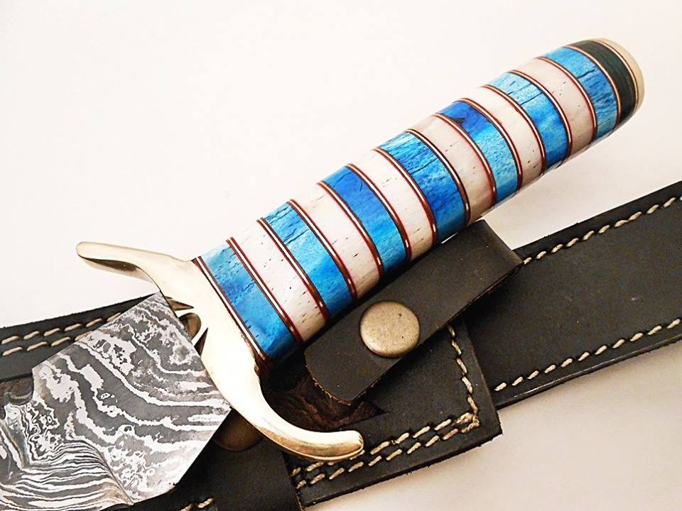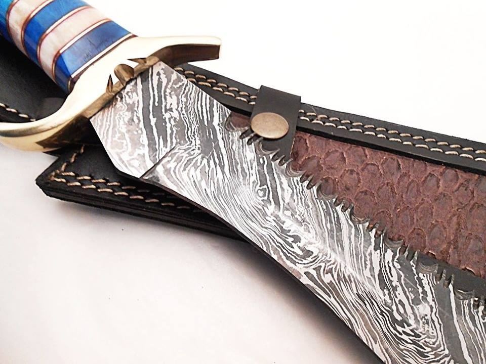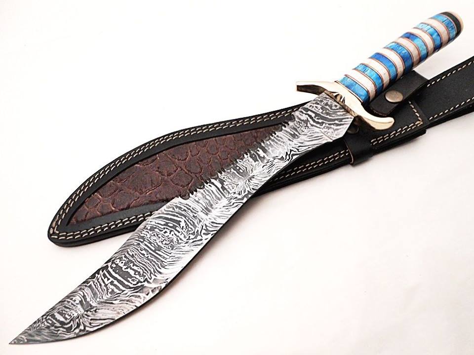 HERE WE HAVE A CUSTOM HAND MADE DAMASCUS STEEL HUNTING BOWIE KNIFE WITH DIFFERENT KIND OF SHAPE. OVER ALL LENGTH IS 17.50 INCHES, HANDLE IS MADE OF NATURAL WITH BLUE COLORED CAMEL BONE, BLADE WITH A FIRE PATTERN.