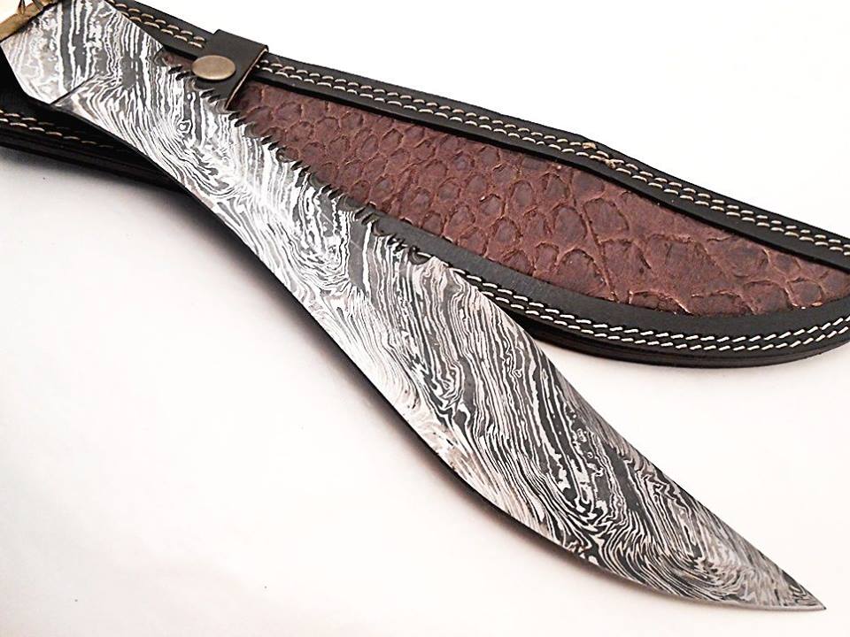 Fired Bowie Hunting Knife Custom Handmade Damascus Steel Survival Knife Beautiful Natural With Blue Colored Camel Bone Handle That’s Make a Beautiful Combination of 17.50 Inches Knife For Outdoor, Camping, Hunting & Survival Purpose With Amazing Handmade Genuine Leather Sheath