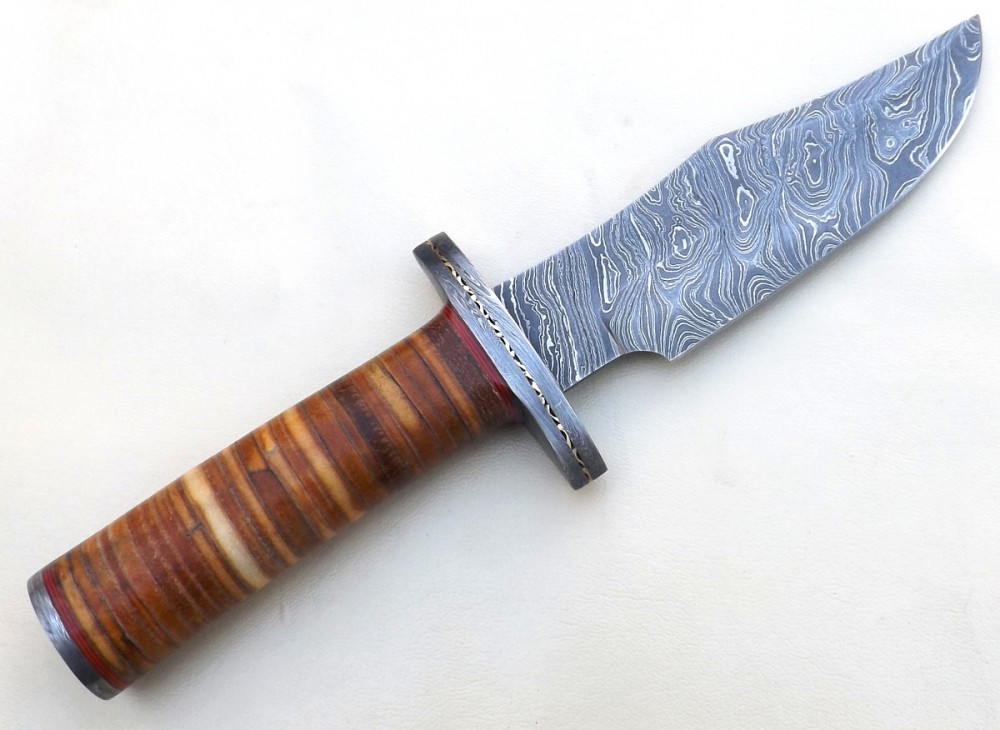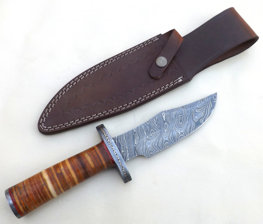 HERE WE HAVE A CUSTOM HAND MADE DAMASCUS STEEL HUNTING BOWIE KNIFE WITH DIFFERENT KIND OF SHAPE. OVER ALL LENGTH IS 12.00 INCHES, HANDLE IS MADE OF NATURAL LEATHER WITH ROSE WOOD, BLADE WITH A TWIST PATTERN.