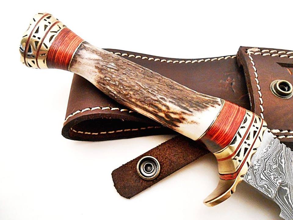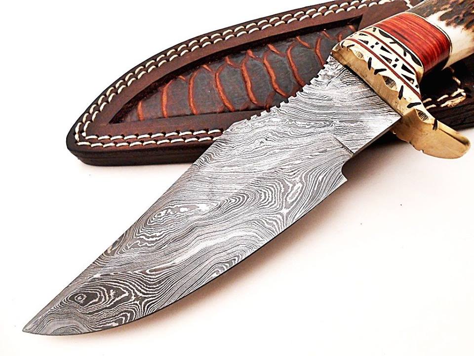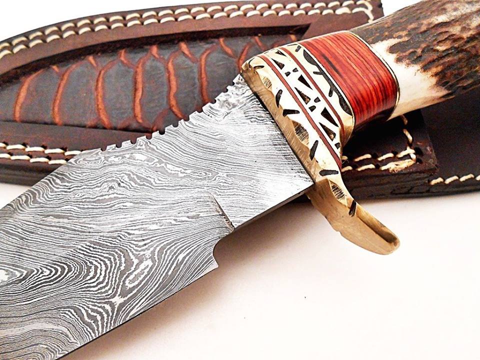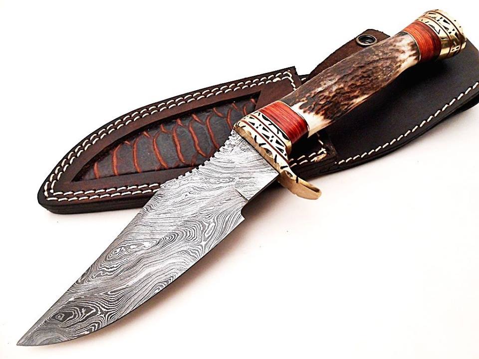 Ideal Bowie Hunting Knife Custom Handmade Damascus Steel Survival Knife Beautiful Natural Stag Horn With Red Colored Wood Handle That’s Make a Beautiful Combination of 12.00 Inches Knife For Outdoor, Camping, Hunting & Survival Purpose With Amazing Handmade Genuine Leather Sheath