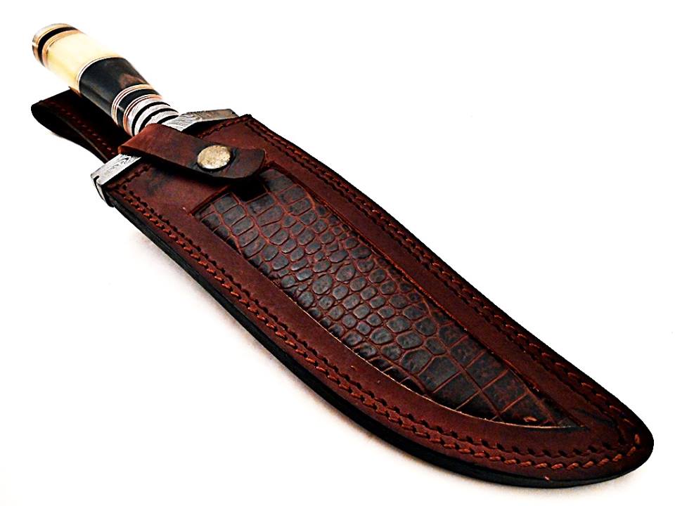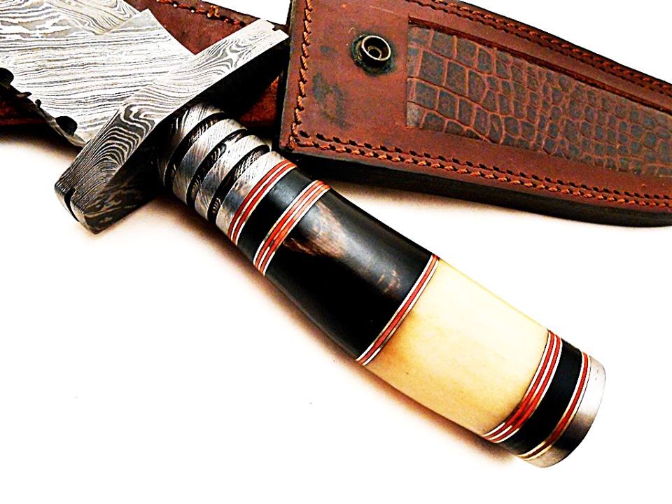 Incredible Bowie Hunting Knife Custom Handmade Damascus Steel Survival Knife Beautiful Natural Camel Bone With Buffalo Horn Handle That’s Make a Beautiful Combination of 13.25 Inches Knife For Outdoor, Camping, Hunting & Survival Purpose With Amazing Handmade Genuine Leather Sheath