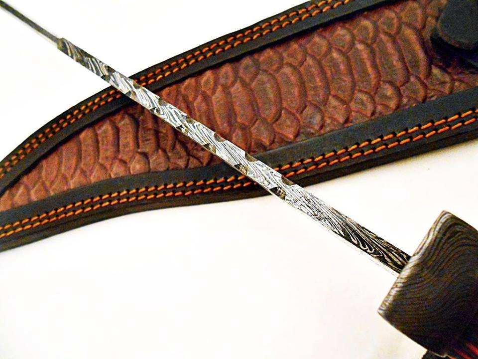 HERE WE HAVE A CUSTOM HAND MADE DAMASCUS STEEL HUNTING BOWIE KNIFE WITH DIFFERENT KIND OF SHAPE. OVER ALL LENGTH IS 17.00 INCHES, HANDLE IS MADE OF RED COLORED WOOD, BLADE WITH A FIRE PATTERN.