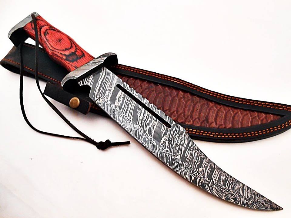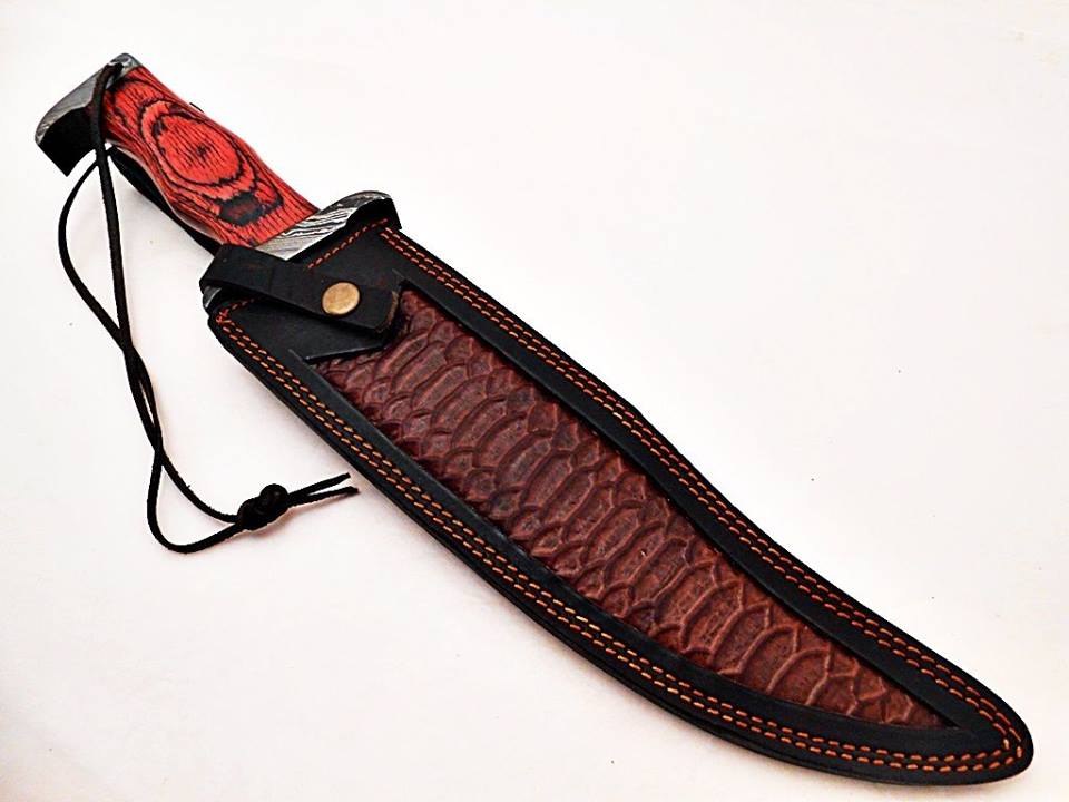 Incredible Bowie Hunting Knife Custom Handmade Damascus Steel Survival Knife Beautiful Red Colored Wood Handle That’s Make a Beautiful Combination of 17.00 Inches Knife For Outdoor, Camping, Hunting & Survival Purpose With Amazing Handmade Genuine Leather Sheath