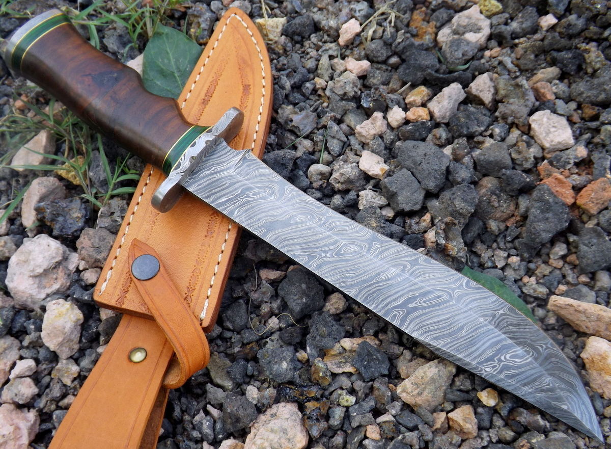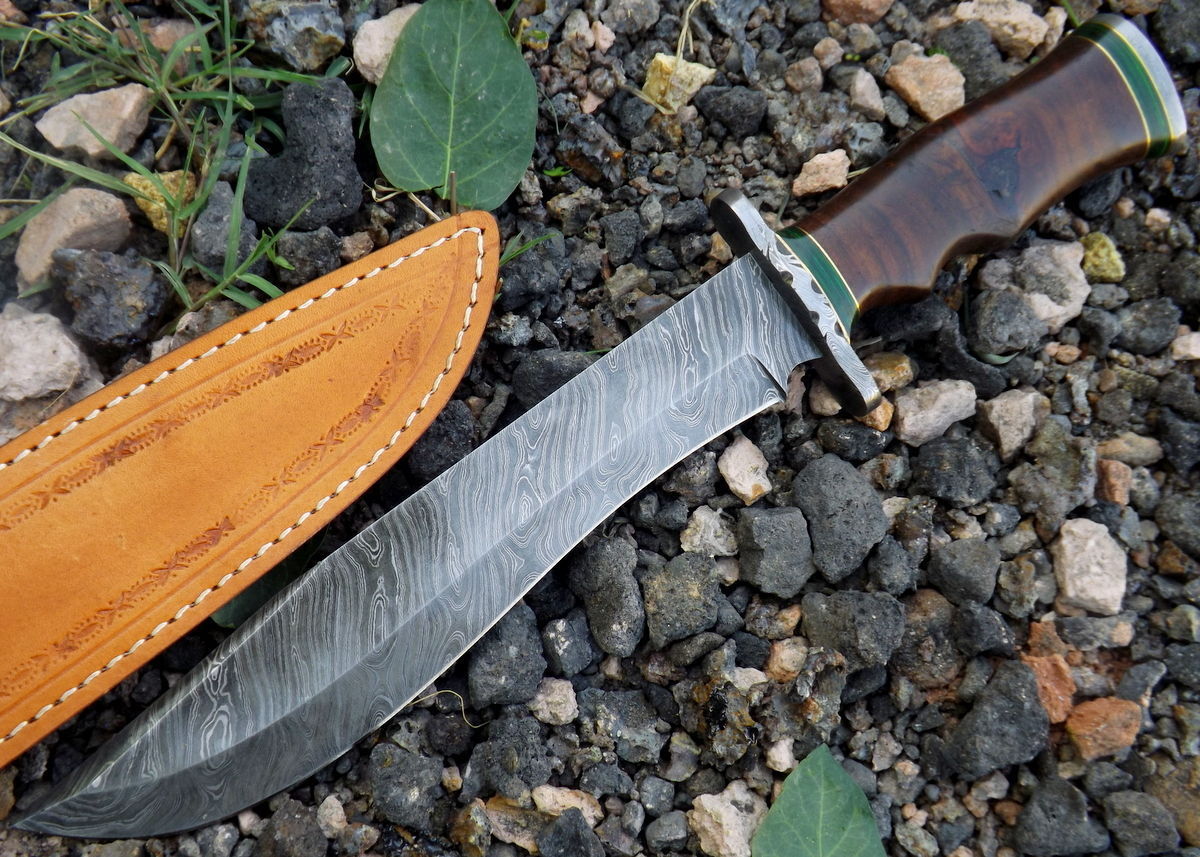 Innovative Bowie Hunting Knife Custom Handmade Damascus Steel Survival Knife Beautiful Rose Wood With Green Wood Handle That’s Make a Beautiful Combination of 15.00 Inches Knife For Outdoor, Camping, Hunting & Survival Purpose With Amazing Handmade Genuine Leather Sheath