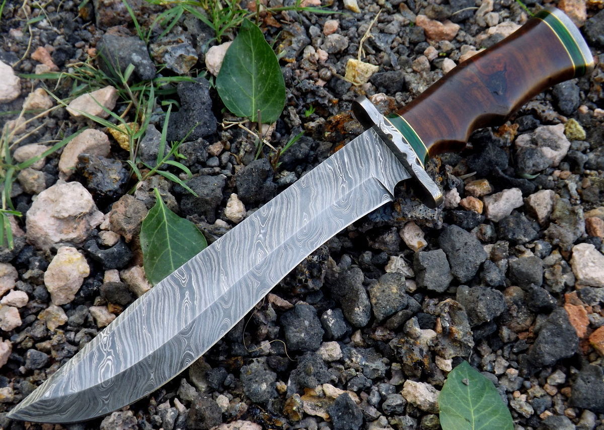 Custom Handmade Damascus Steel Hunting Bowie Knives For Hunting, Outdoors, Camping And Survival Purposes. High Quality Material Used On Handles Like Rose Wood, Oak Wood, Olive Wood, Resin Wood, Resin Sheet, Micarta, Ram Horn, Stag Horn and Damascus Steel Mostly Used On Blade.