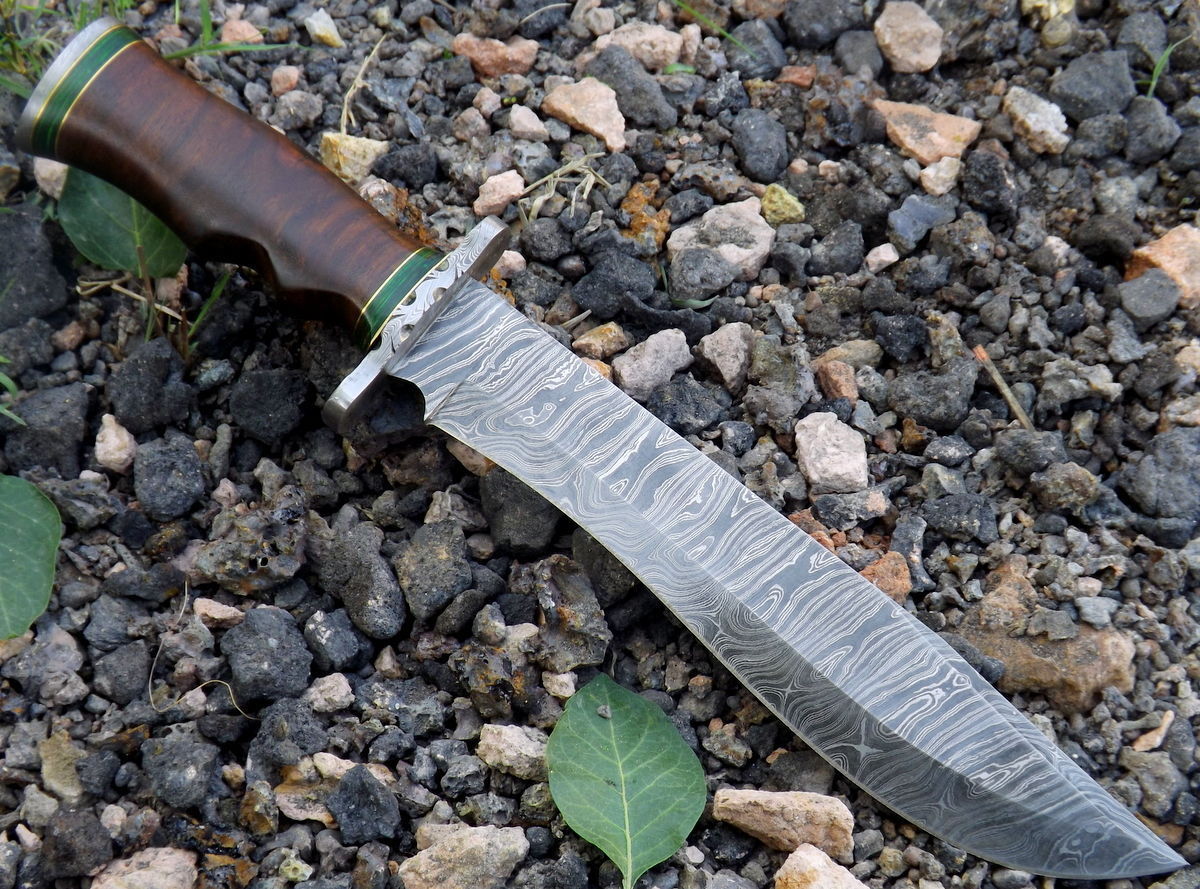 HERE WE HAVE A CUSTOM HAND MADE DAMASCUS STEEL HUNTING BOWIE KNIFE WITH DIFFERENT KIND OF SHAPE. OVER ALL LENGTH IS 15.00 INCHES, HANDLE IS MADE OF ROSE WOOD WITH GREEN WOOD, BLADE WITH A TWIST PATTERN.