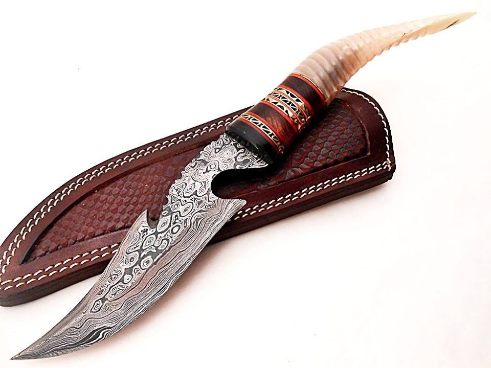 HERE WE HAVE A CUSTOM HAND MADE DAMASCUS STEEL HUNTING BOWIE KNIFE WITH DIFFERENT KIND OF SHAPE. OVER ALL LENGTH IS 12.50 INCHES, HANDLE IS MADE OF NATURAL MOUNTAIN GOAT HORN, BLADE WITH A RAIN DROP PATTERN.