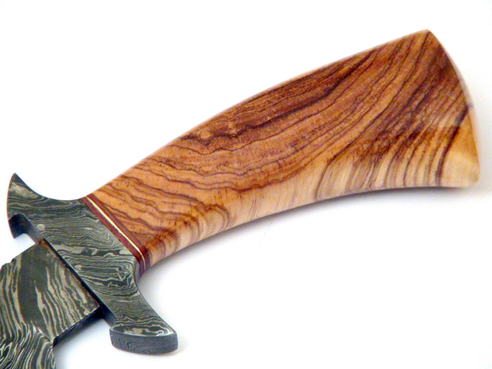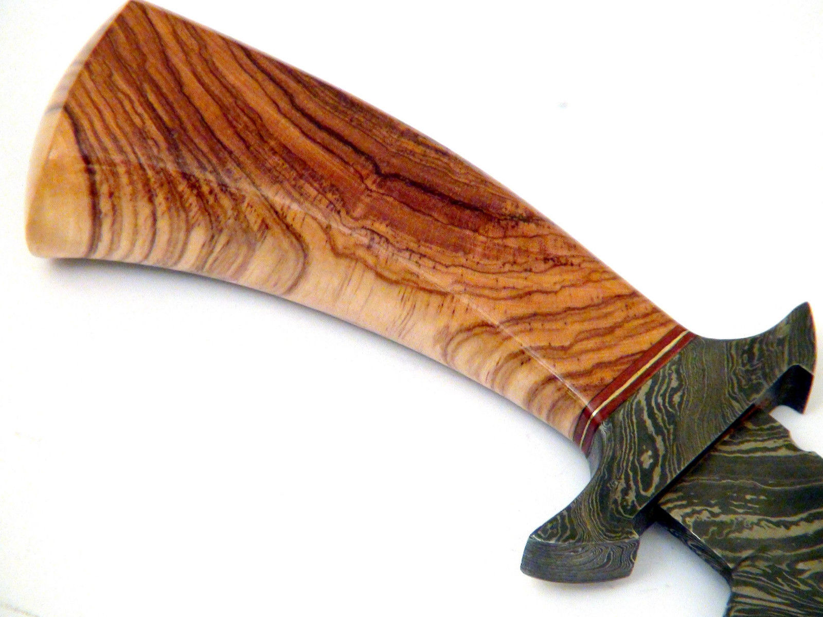 HERE WE HAVE A CUSTOM HAND MADE DAMASCUS STEEL HUNTING BOWIE KNIFE WITH DIFFERENT KIND OF SHAPE. OVER ALL LENGTH IS 14.00 INCHES, HANDLE IS MADE OF NATURAL OLIVE WOOD, BLADE WITH A FIRE PATTERN.