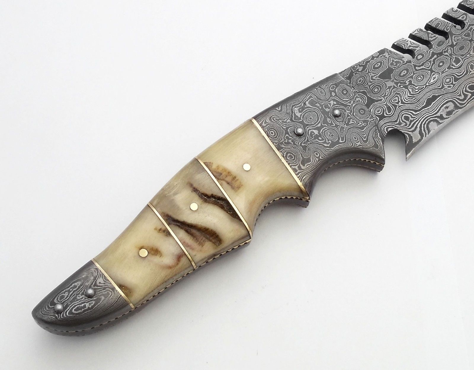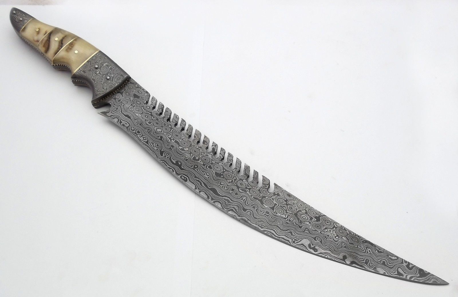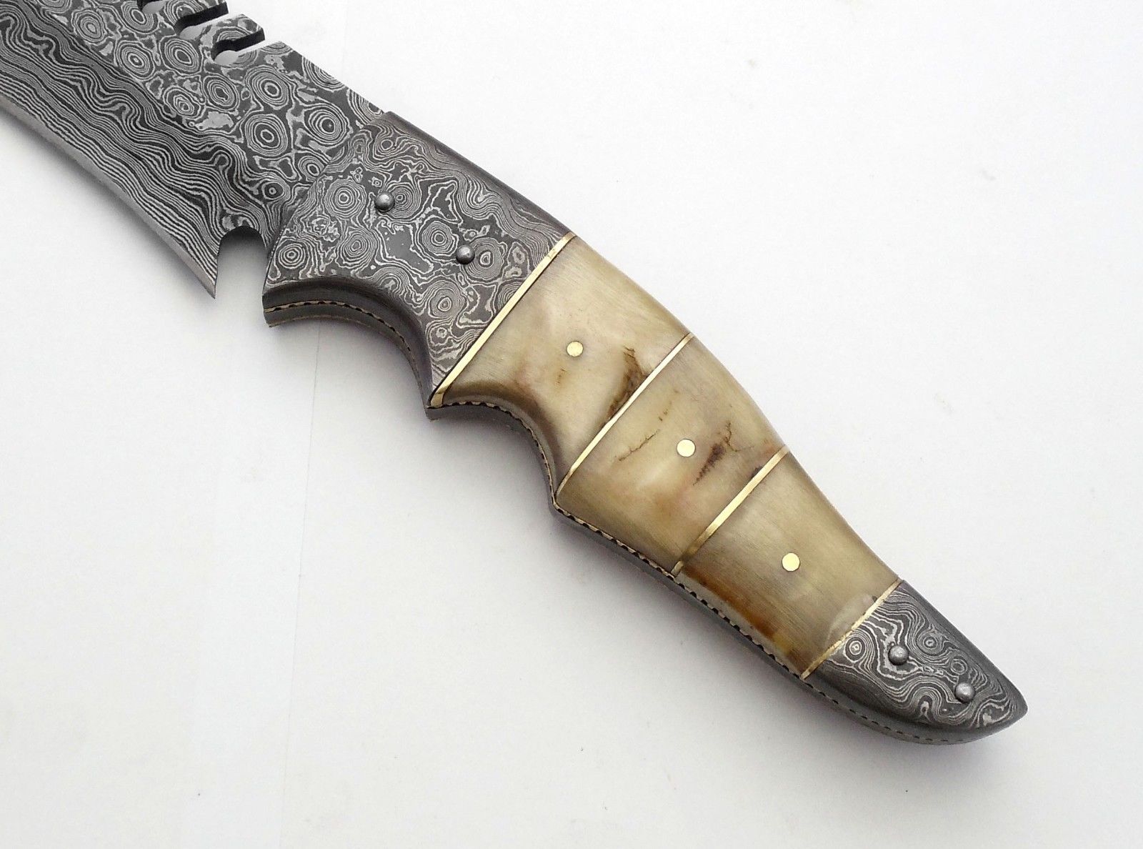 Superb Bowie Hunting Knife Damascus Steel Blade Outdoor Camping-17.00 Inches Beautiful NATURAL RAM HORN Handle With Leather Sheath