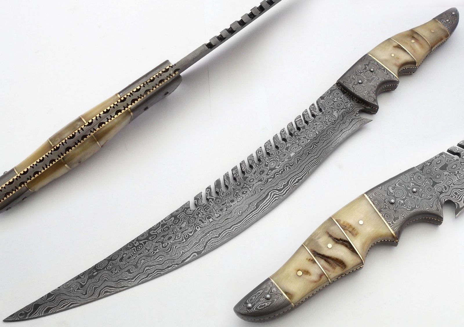 HERE WE HAVE A CUSTOM HAND MADE DAMASCUS STEEL HUNTING BOWIE KNIFE WITH DIFFERENT KIND OF SHAPE. OVER ALL LENGTH IS 17.00 INCHES, HANDLE IS MADE OF NATURAL RAM HORN, BLADE WITH A RAIN DROP PATTERN.